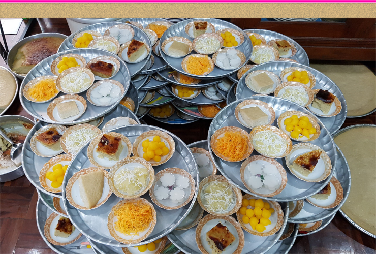 พอดีเมื่อปีก่อนที่บ้านทำบุญบ้านแล้วเห็นเขาวางเรียงซ้อนถาดขนมไว้แล้วดูสวยดีเลยถ่ายเก็บไว้ดูเล่นเพราะนึกถึงตอนเด็กๆ ที่มีส่วนร่วมในขั้นตอนการทำขนมไทยๆ พวกนี้